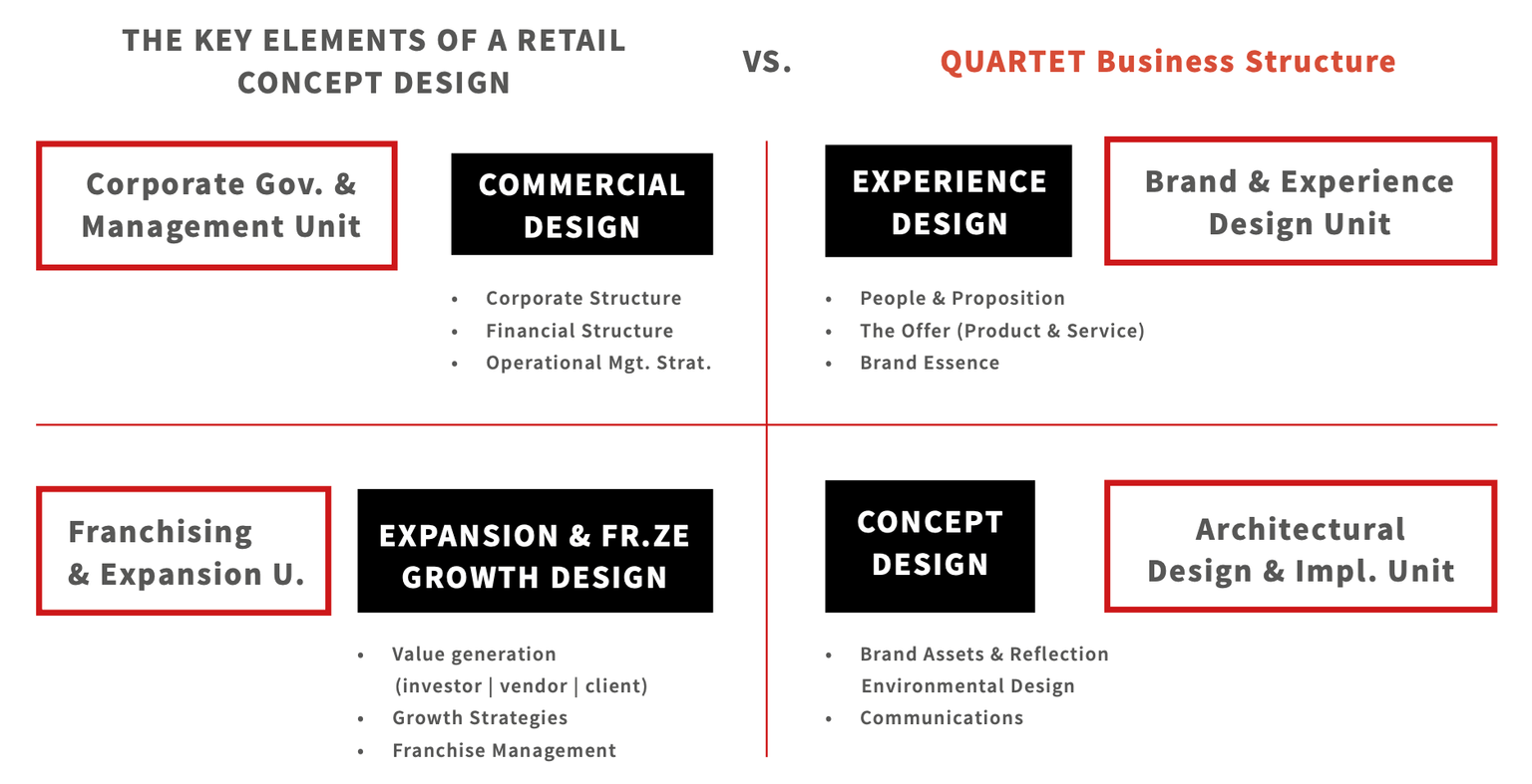 We have a track record of successful collaboration (via separate commercial entities) which has been the inspiration of our project QUARTET for Europe. A one stop shop for any company or investor with a retail business intention “an idea to be decoded and developed”. We take that and design everything from corporate structure to franchise strategy, brand to retail experience, chair to customer satisfaction...